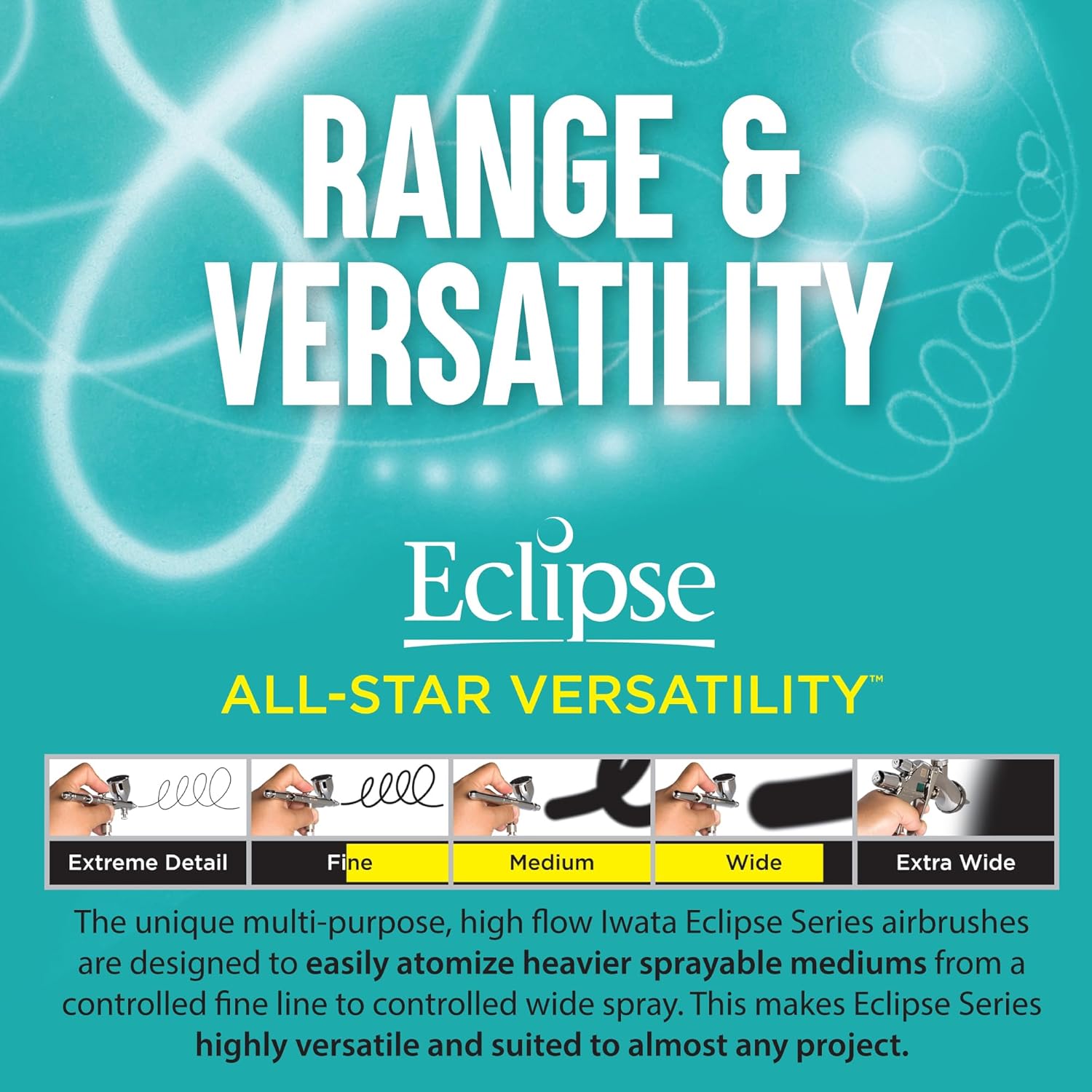 Ultimate versatility, reliability and performance .The multi-purpose, high-paint-flow, high-detail airbrushes of the Eclipse Series cover a wide range of uses. Commonly used to spray premixed or heavier paints, they are well suited for uses demanding precise control of spray when applying moderate-to-large amounts of paint to a variety of surfaces and to various-sized areas. The Eclipse Series has established a new benchmark for excellence in an all-purpose airbrush.